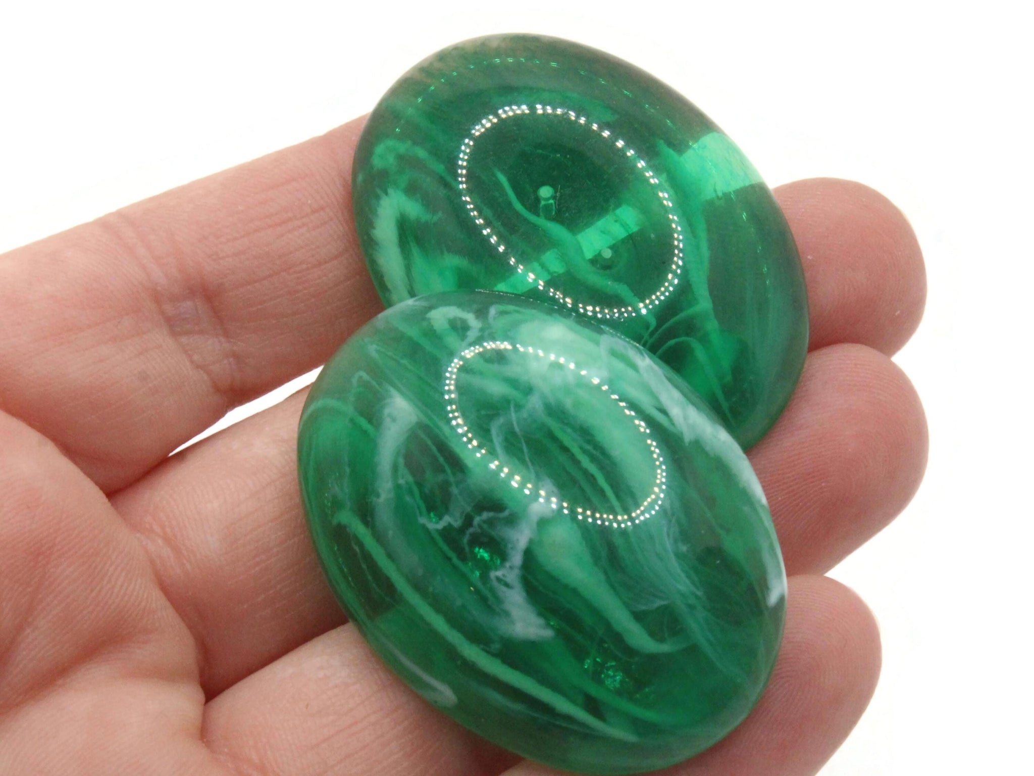 Beautiful green cabochons with lovely swirls give the visual effect of stone. Far lighter than stone, these are a vintage lucite which have been waiting in a warehouse for many years for their chance to shine.