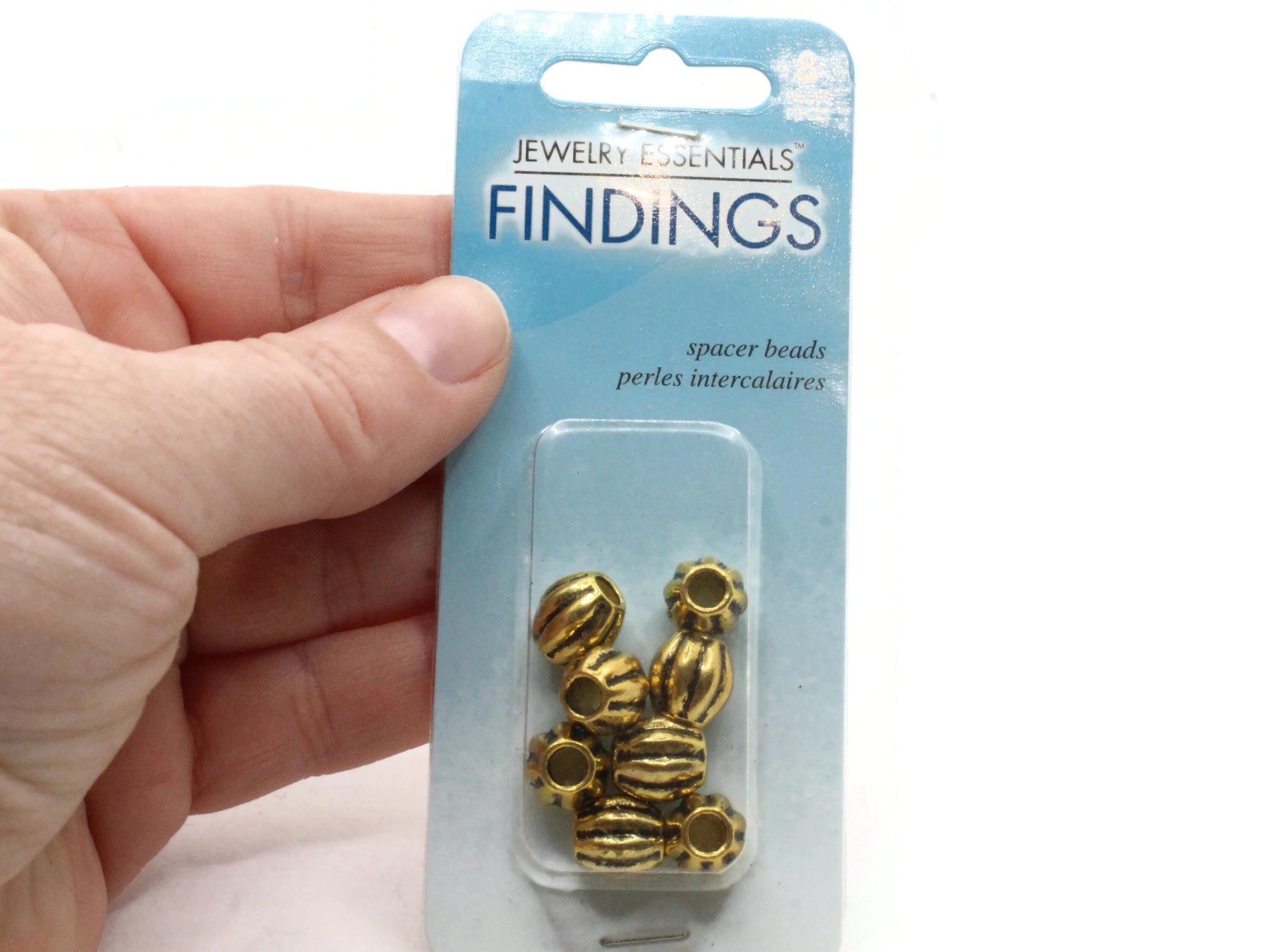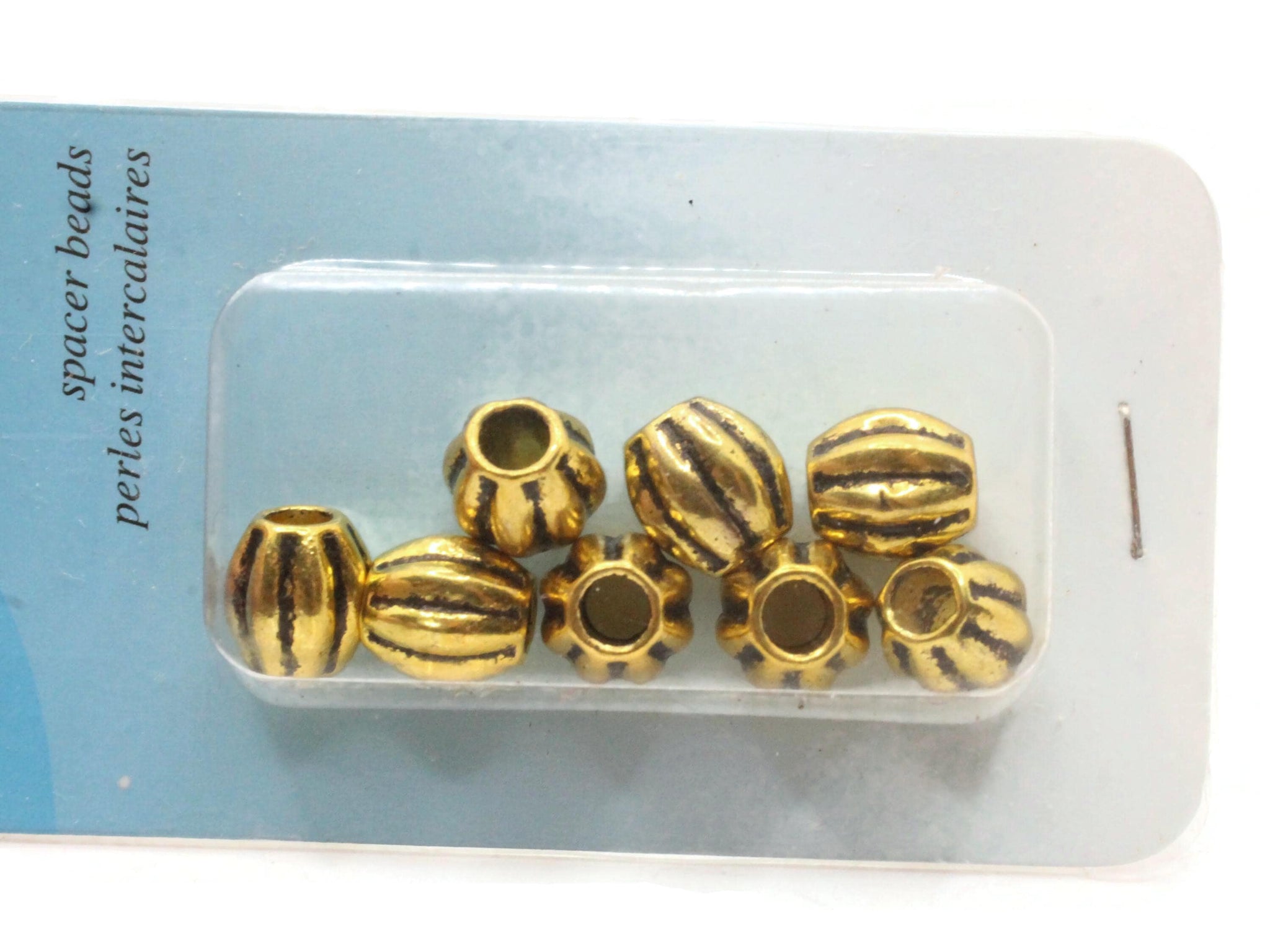 8 Pretty gold tone metal Spacer Beads put out by the company Jewelry Essentials in their findings line. These have a nice large hole, great for larger stringing materials and those with dexterity issues.
