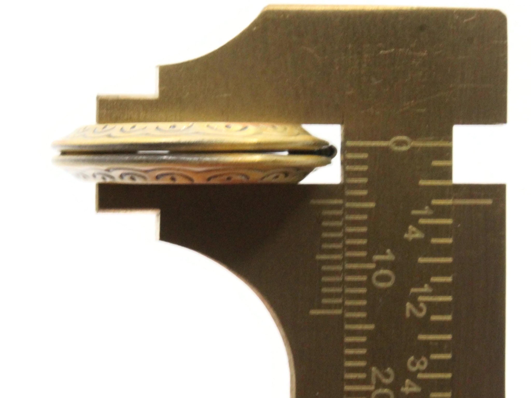 What a lovely little locket. Gorgeous gold tone brass, oval with beautiful scallop design around the edge of the front. The center section is blank and ready to add an 18mm x 13mm cabochon to fill the space. The back is also beautifully decorated. So pretty you could wear it as the front.