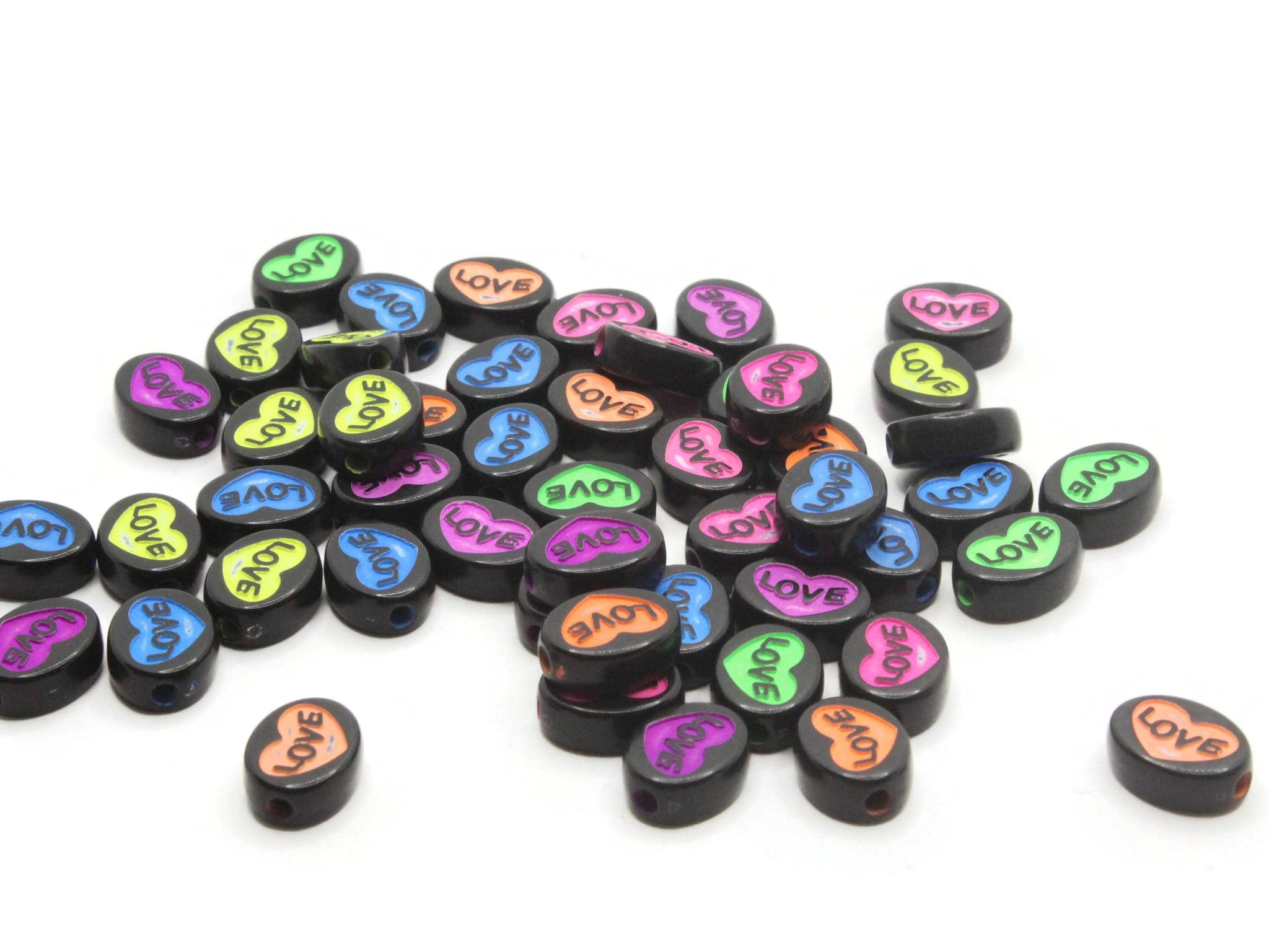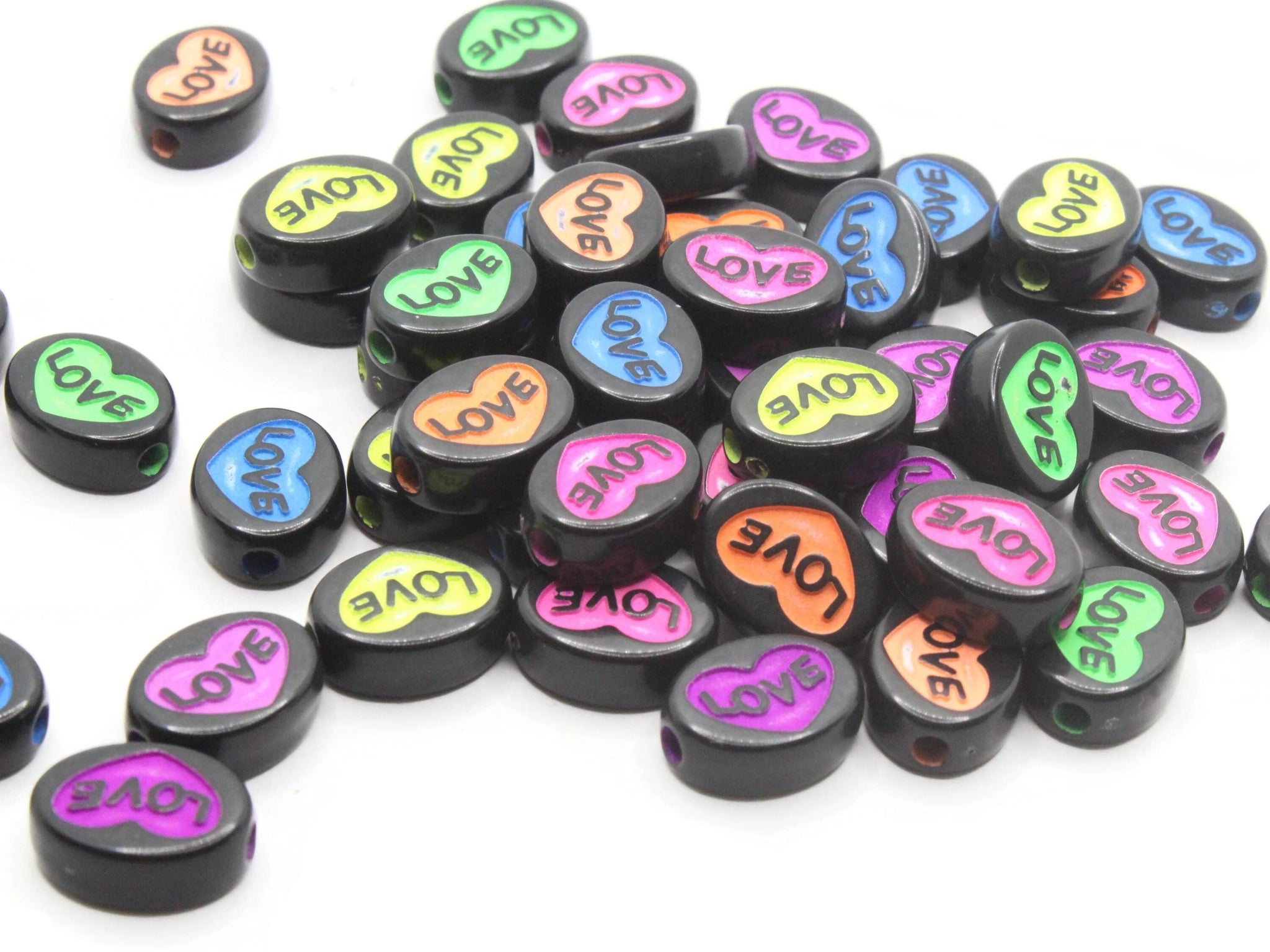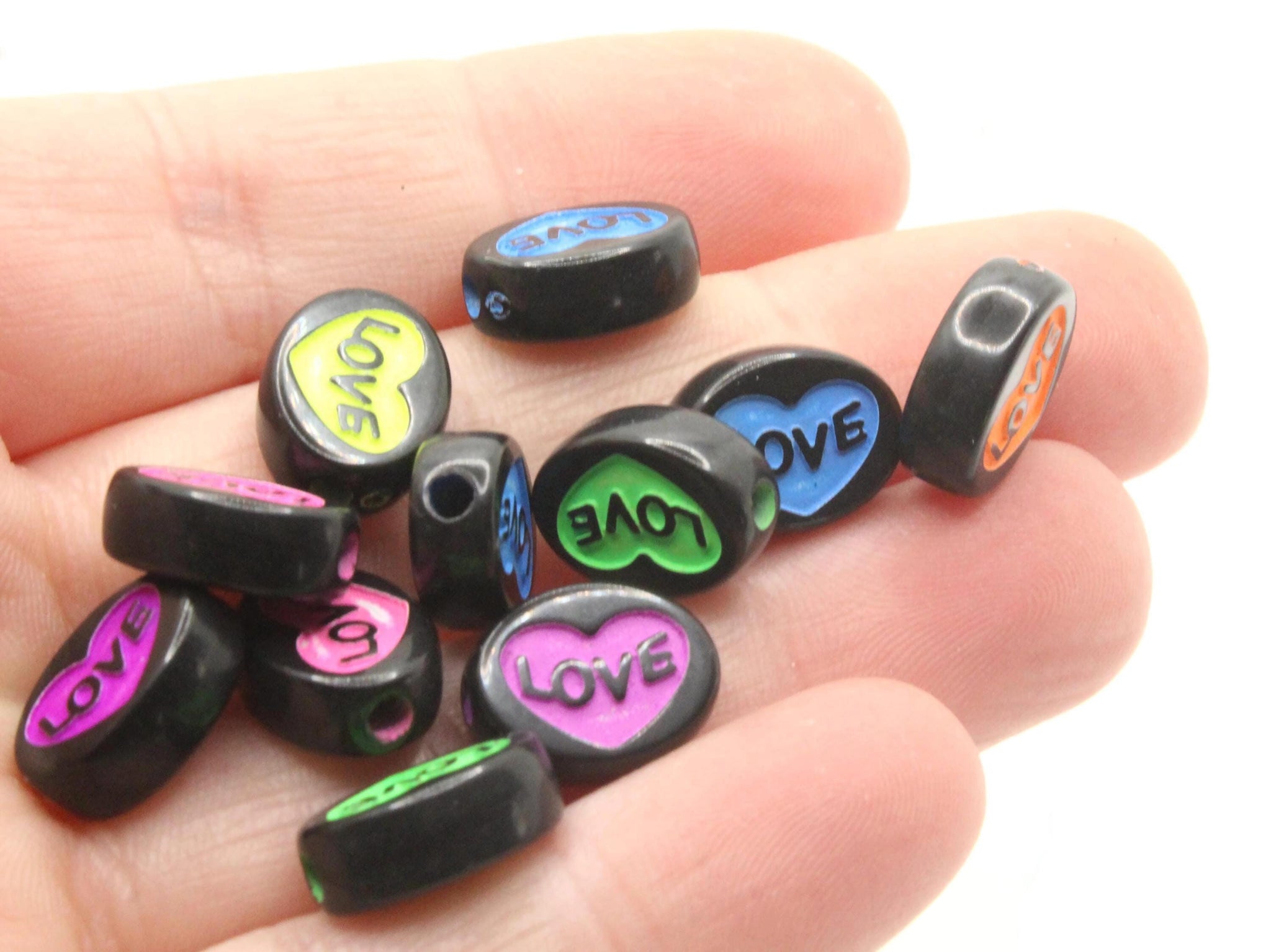 50 13mm Flat Oval Love Black and Neon Mixed Color Plastic Beads