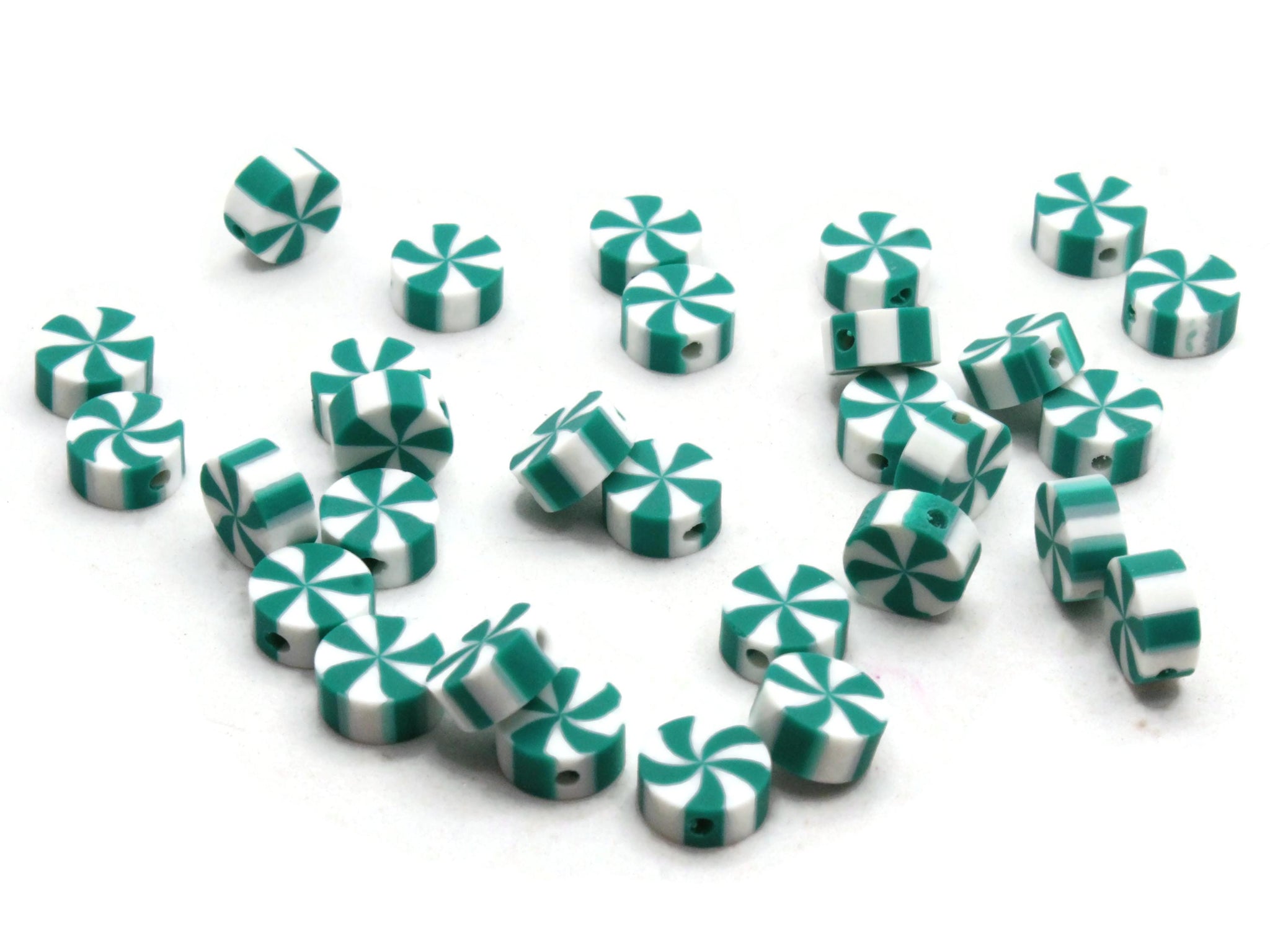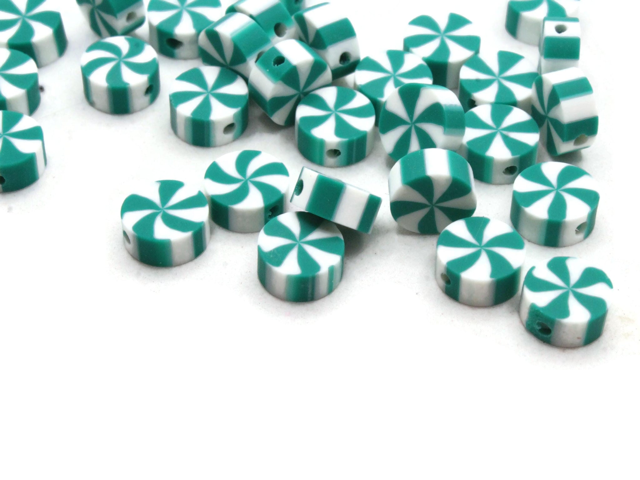 30 9mm Peppermint Polymer Clay Green and White Christmas Small Loose Coin Beads