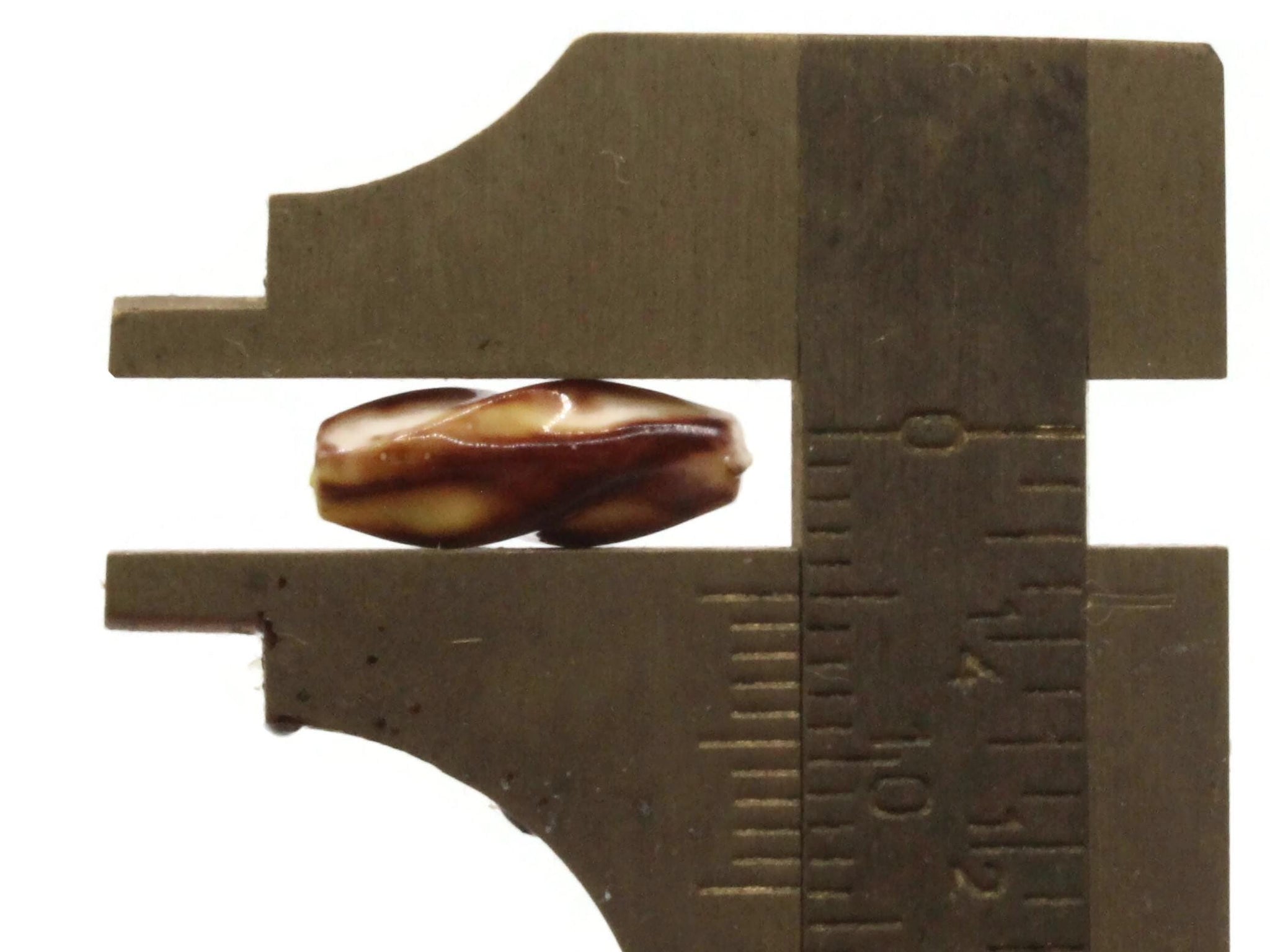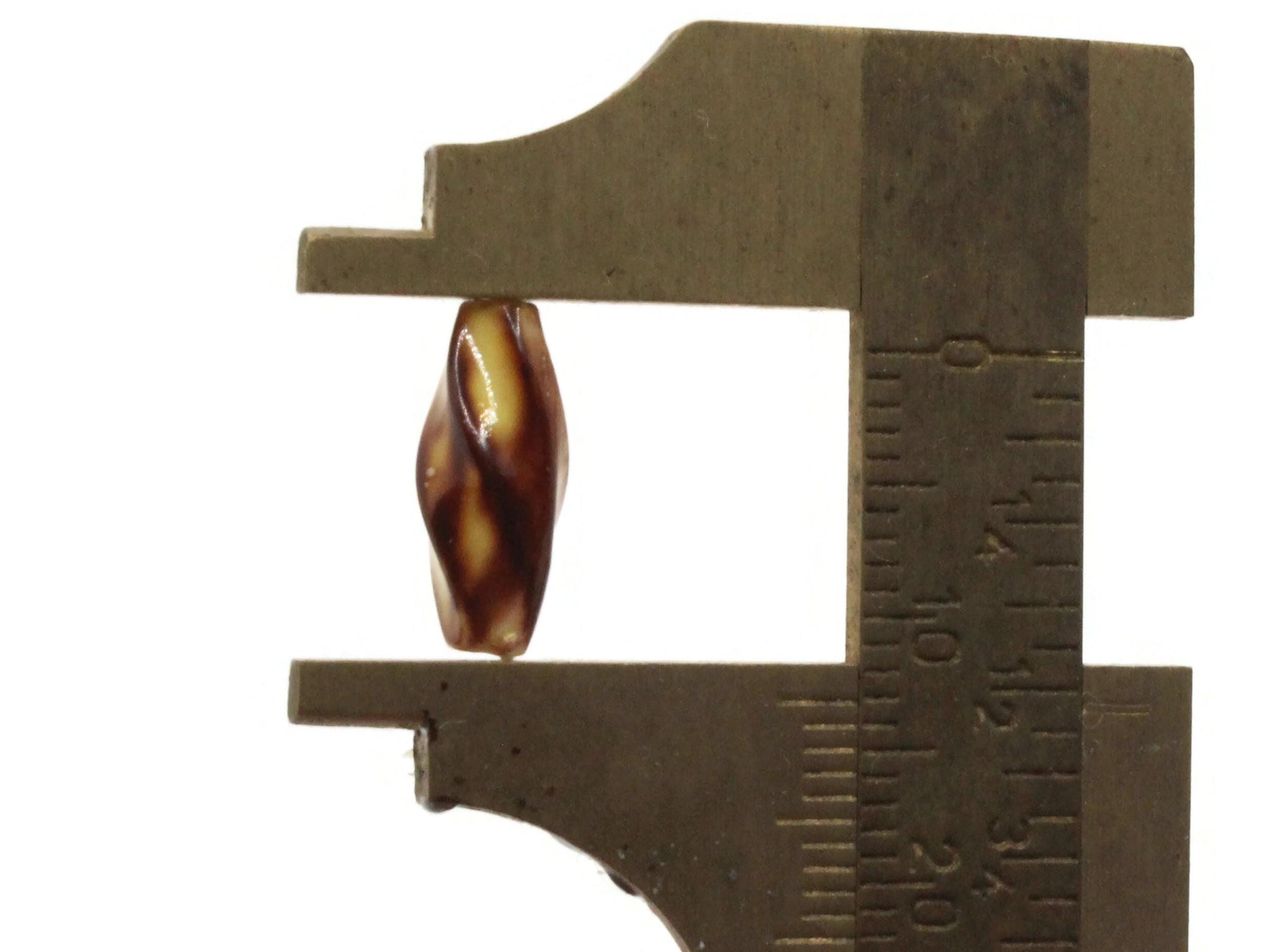 Very fun beads. A twisted tube in varying shades of brown. It juxtaposes the appearance of the organic next to the man-made nature of the beads very nicely.