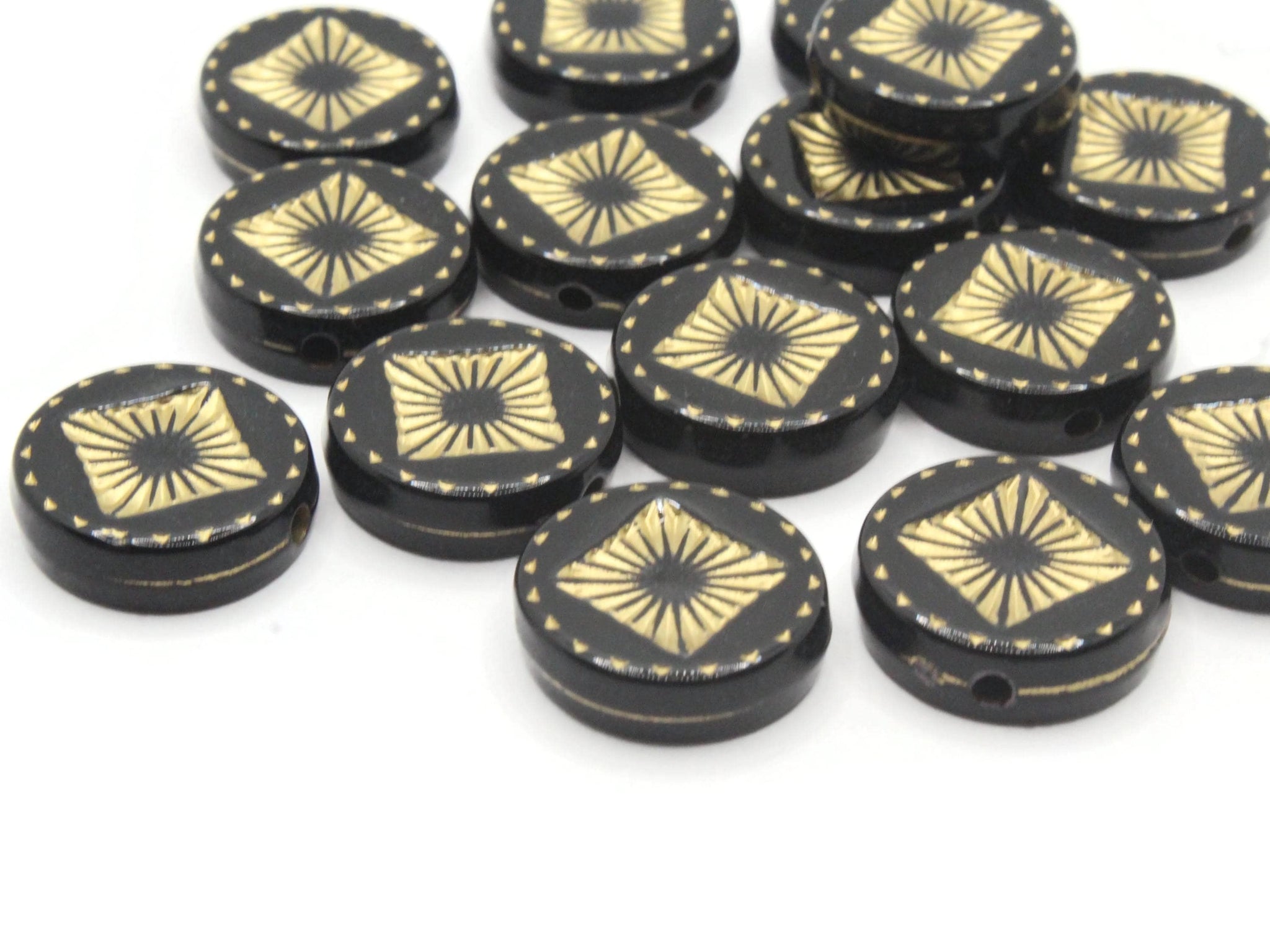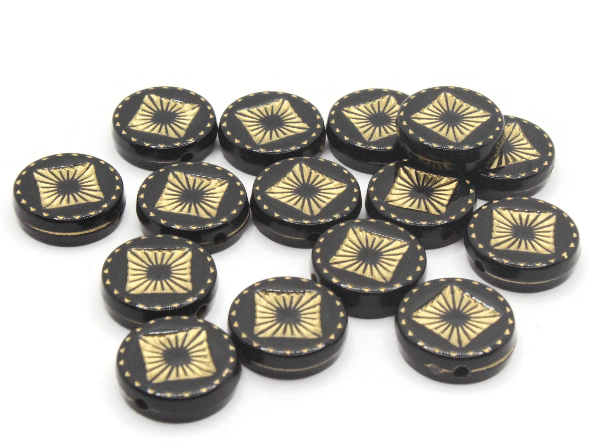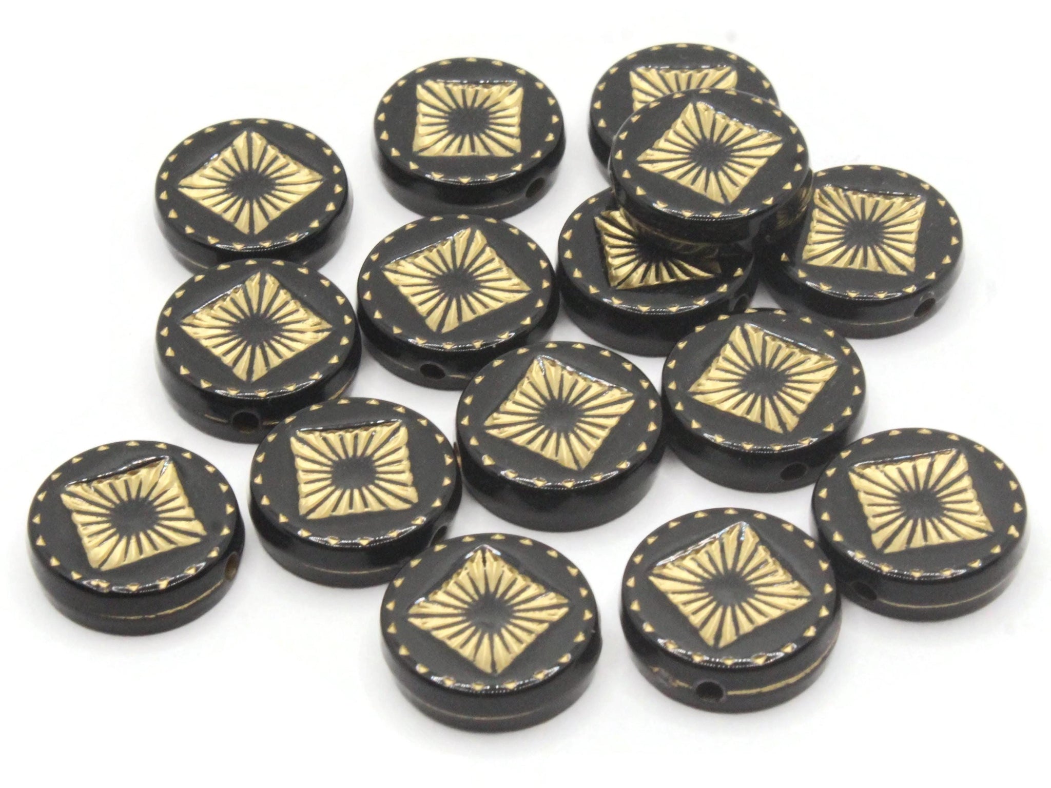 15 15mm Black Coin Shaped Plastic Beads with Gold Square Design