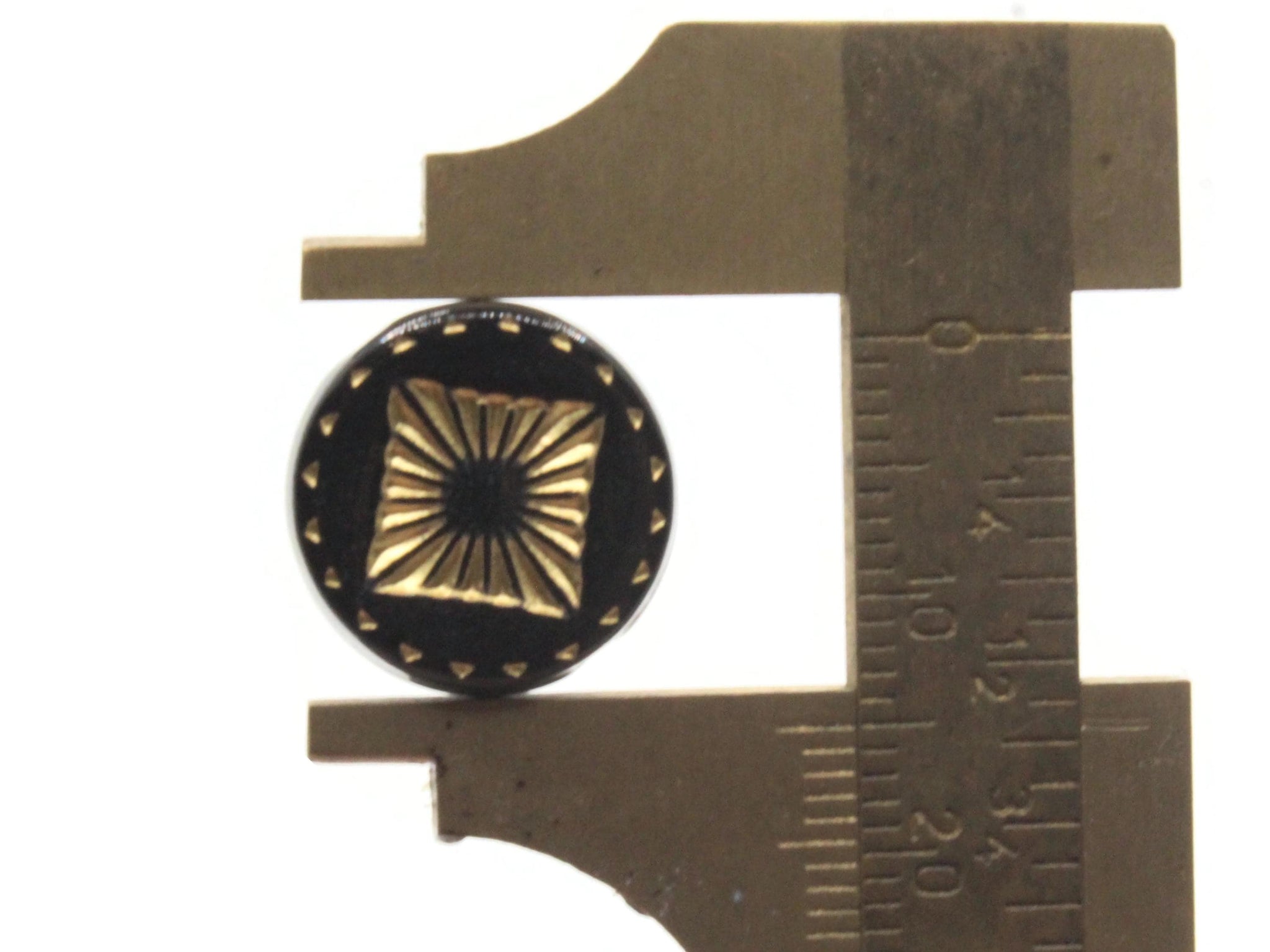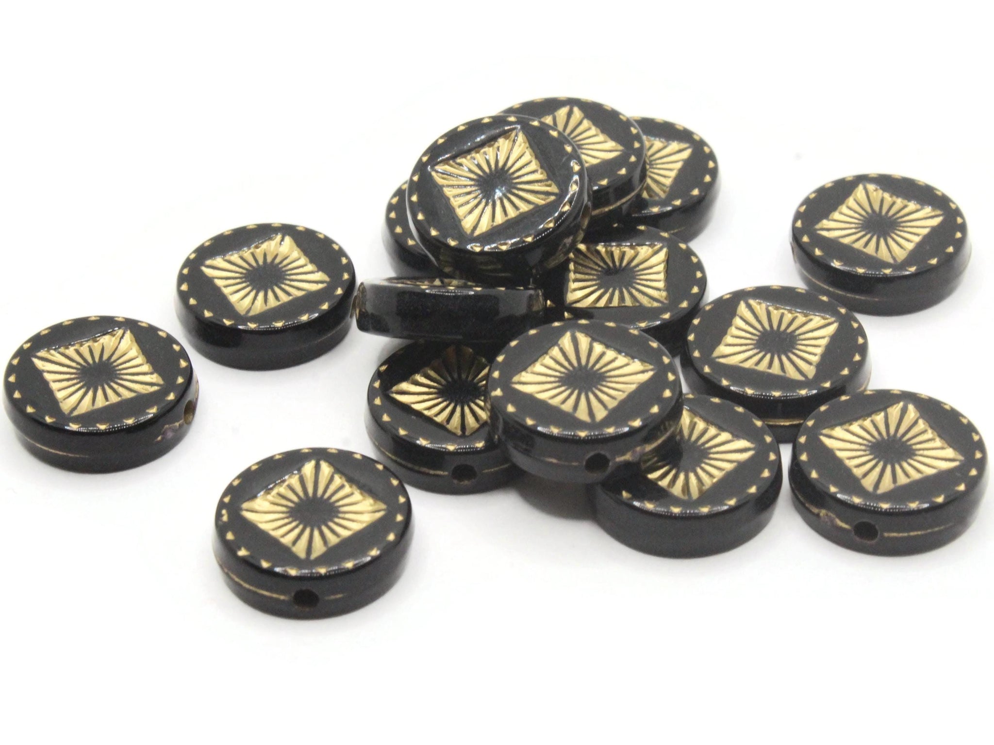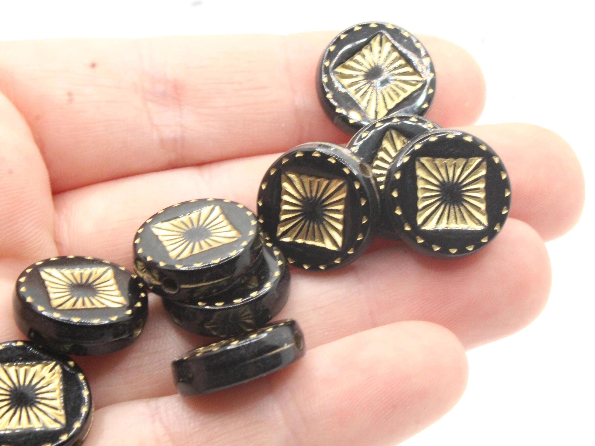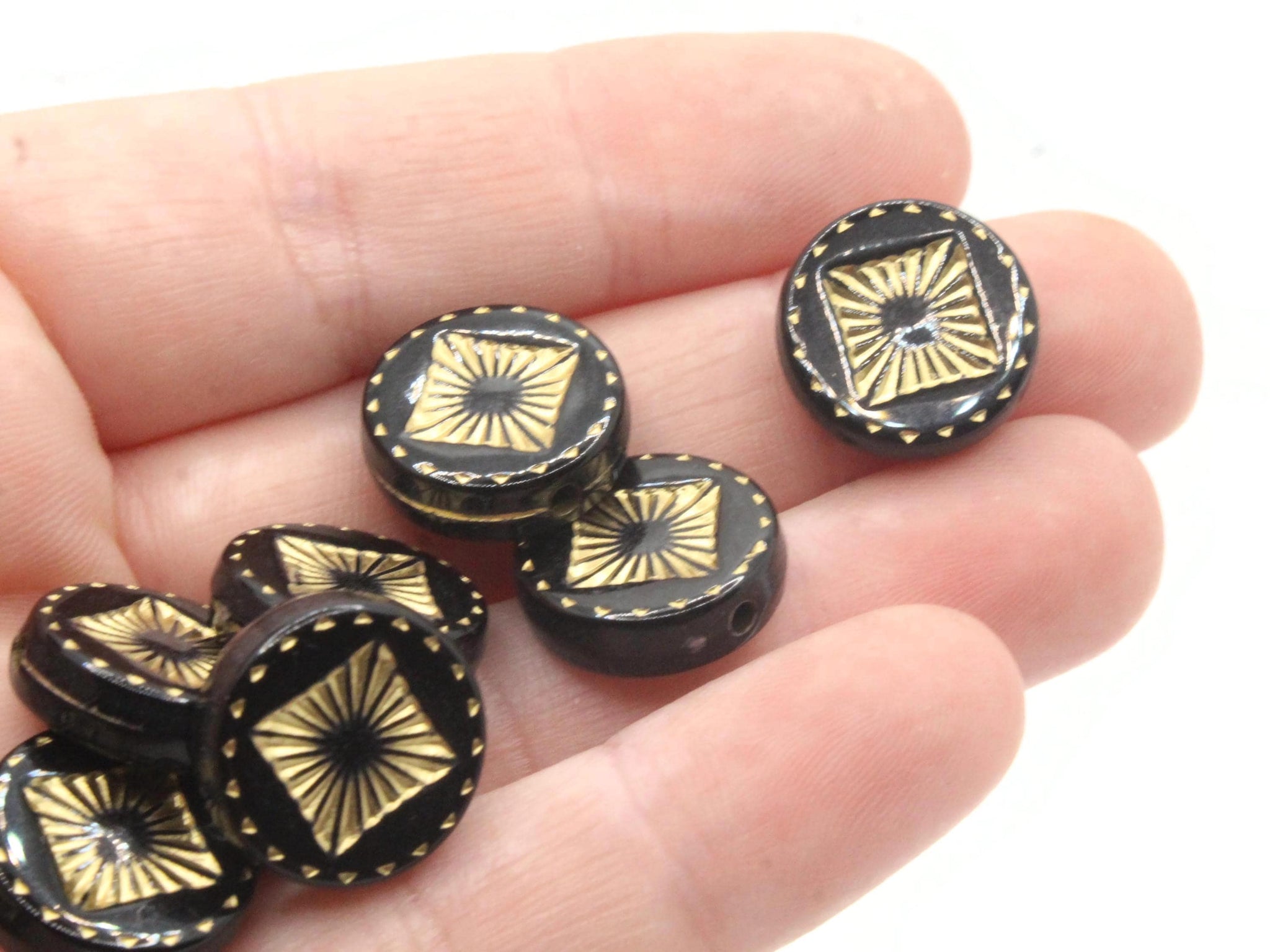 15 15mm Black Coin Shaped Plastic Beads with Gold Square Design