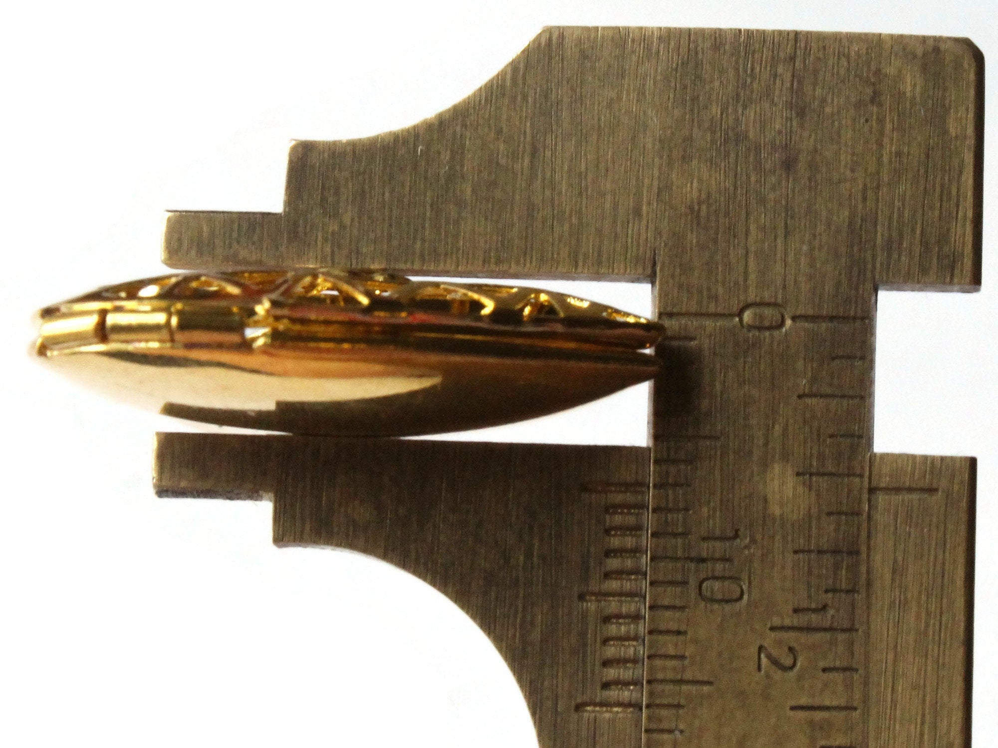 What a lovely little locket. Gorgeous gold tone brass. The front is a filigree grid, great for using a diffuser pendant or for catching glimpses of your loved one's picture inside.