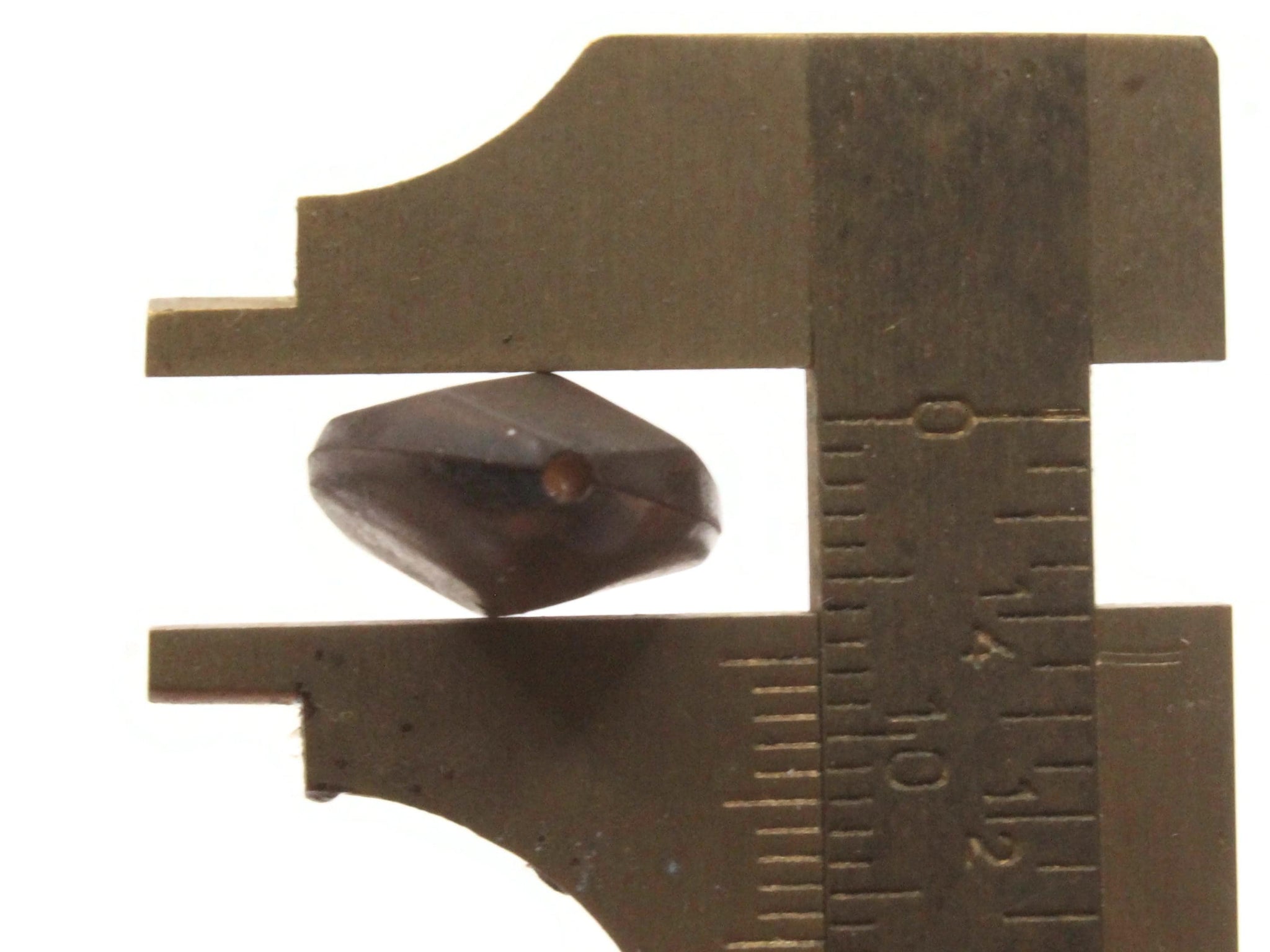 21mm long, 13mm Wide, 7mm thick About 2mm hole, perhaps a little smaller
