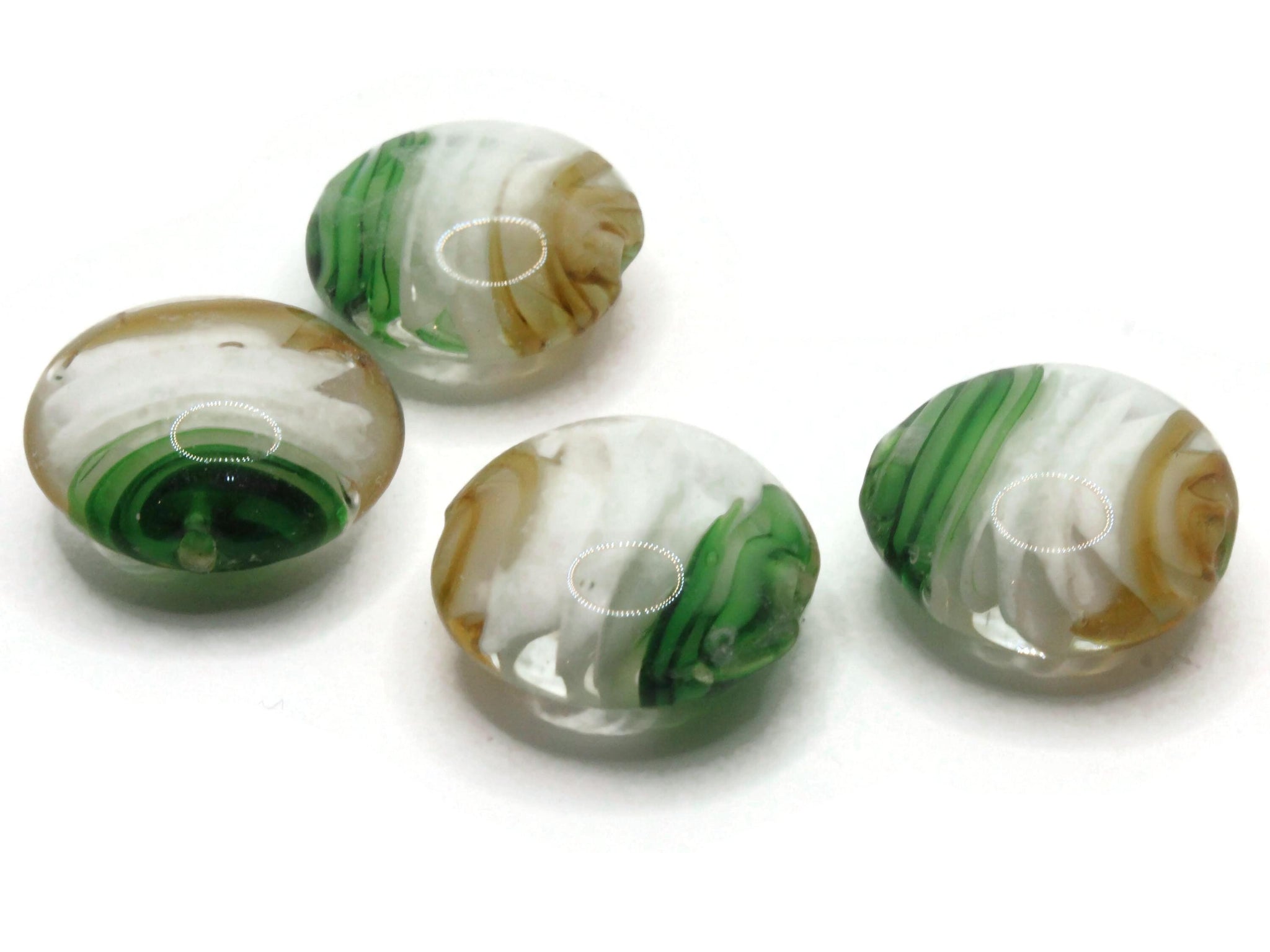 4 20mm Brown White and Green Swirling Coin Flat Round Lampwork Glass Beads