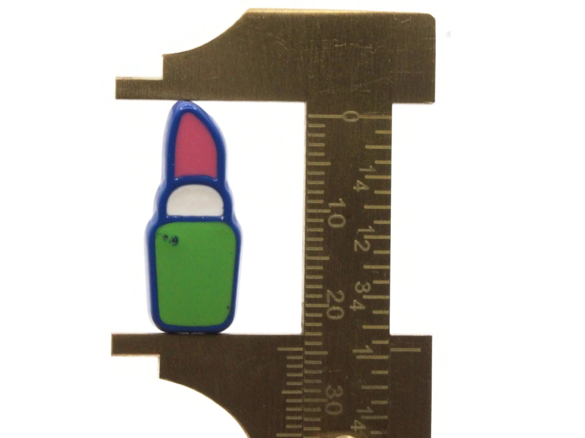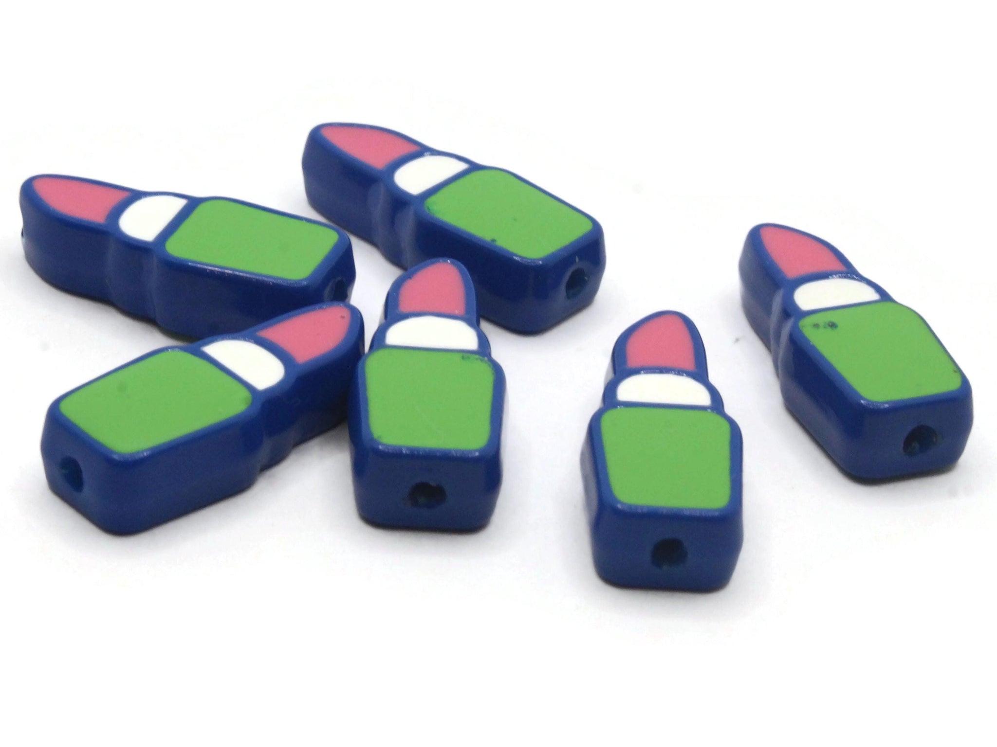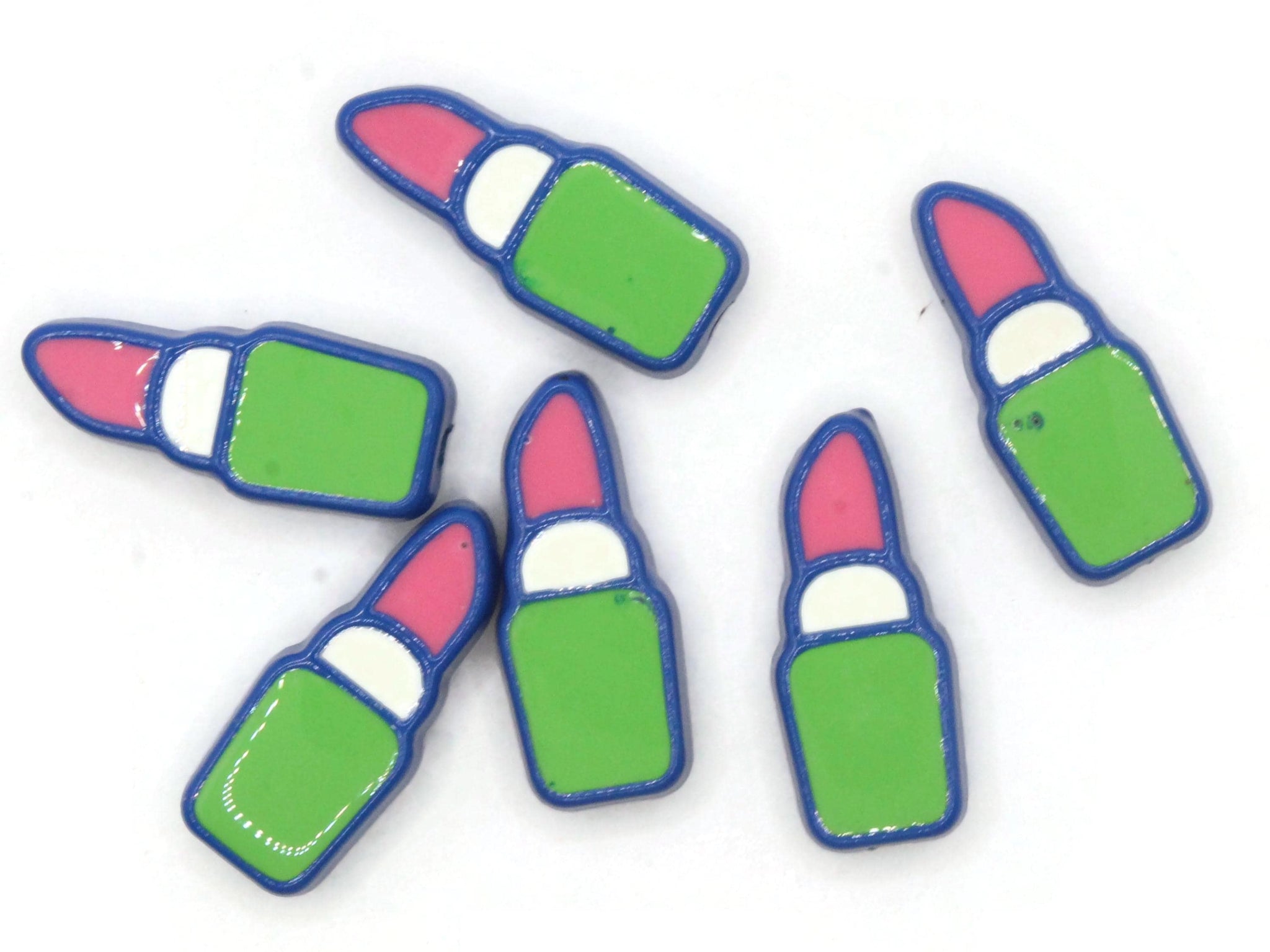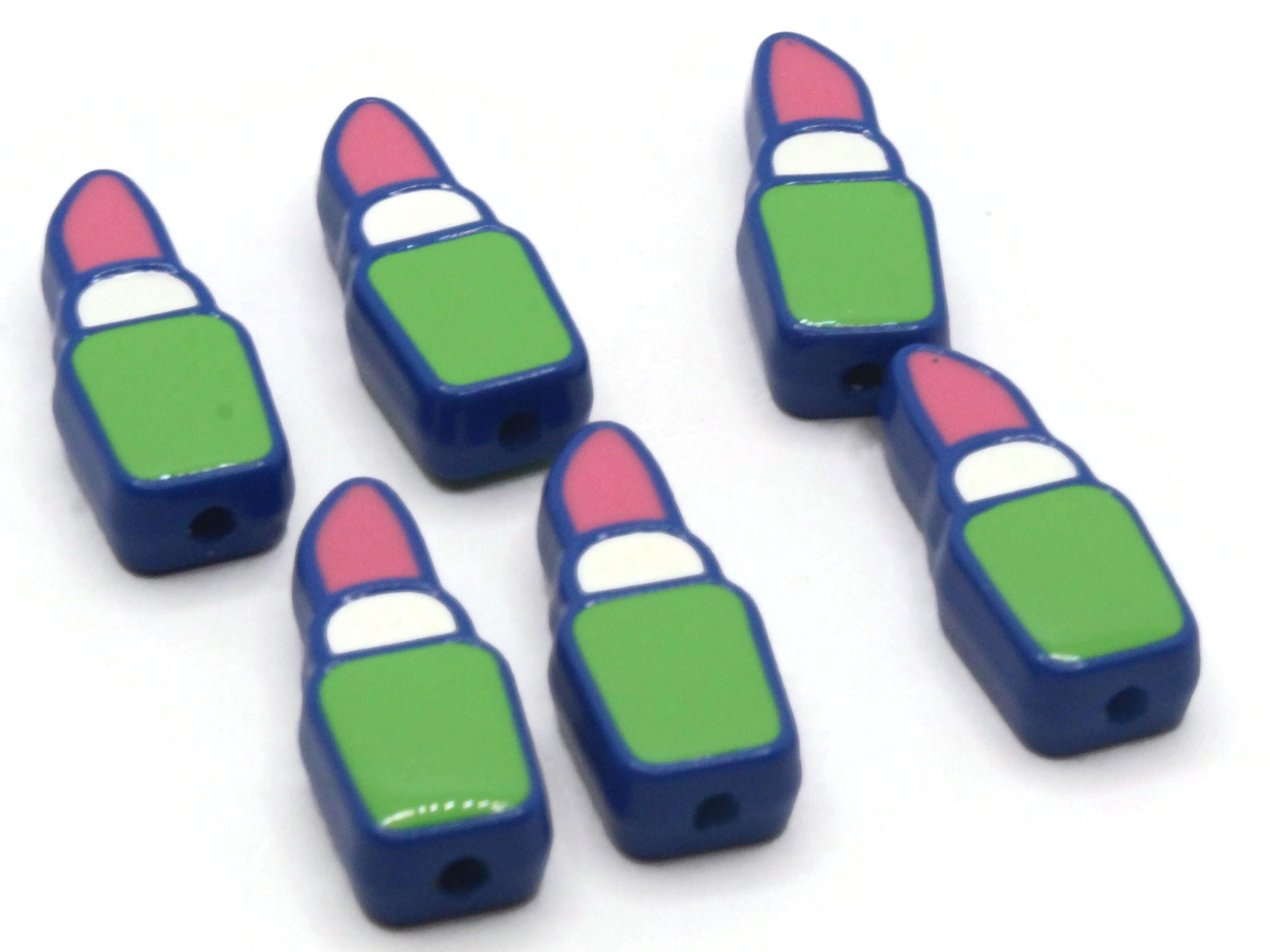 6 24mm Pink Lipstick with Green and White Enamel Tube on Blue Plastic Beads