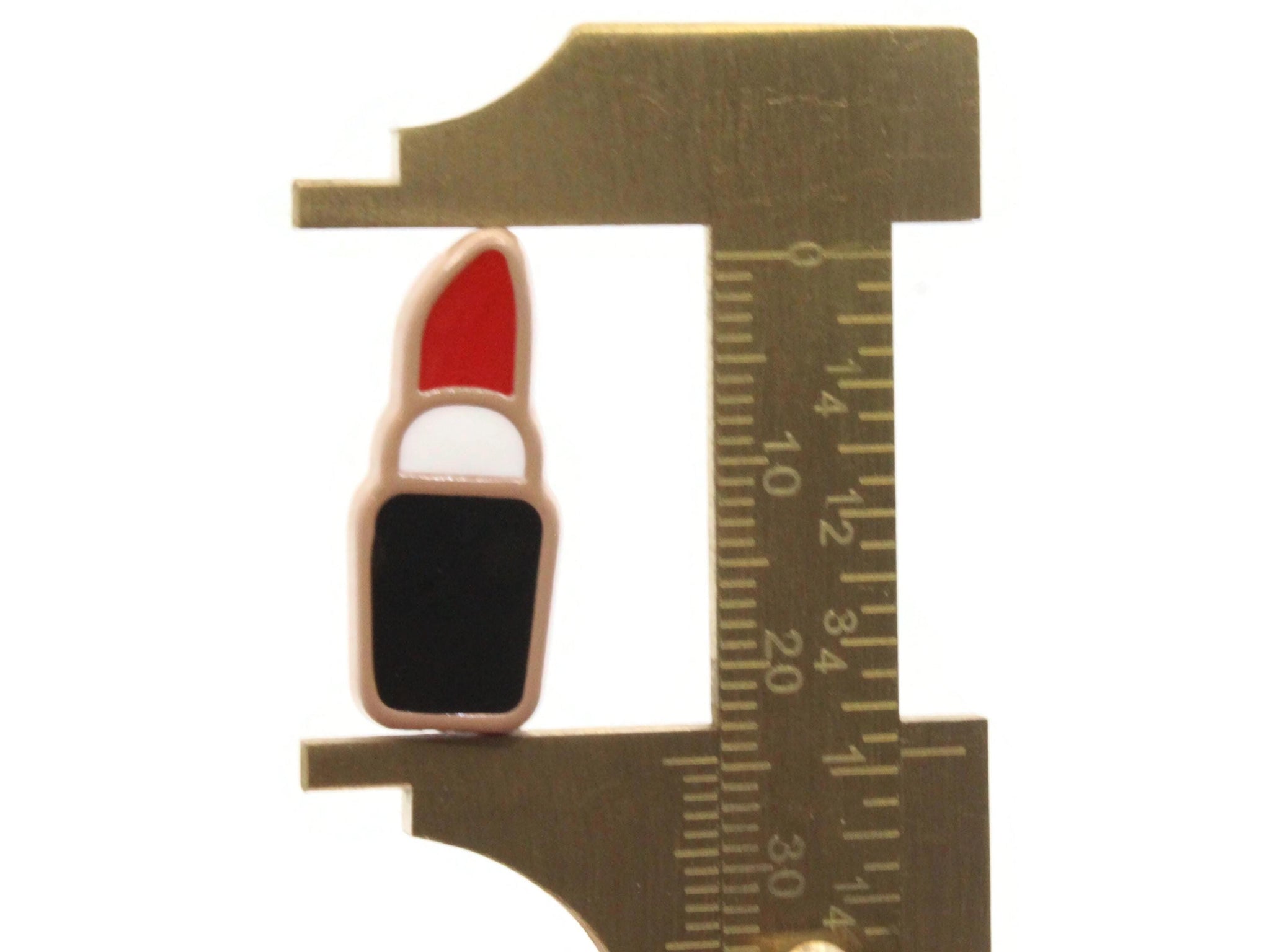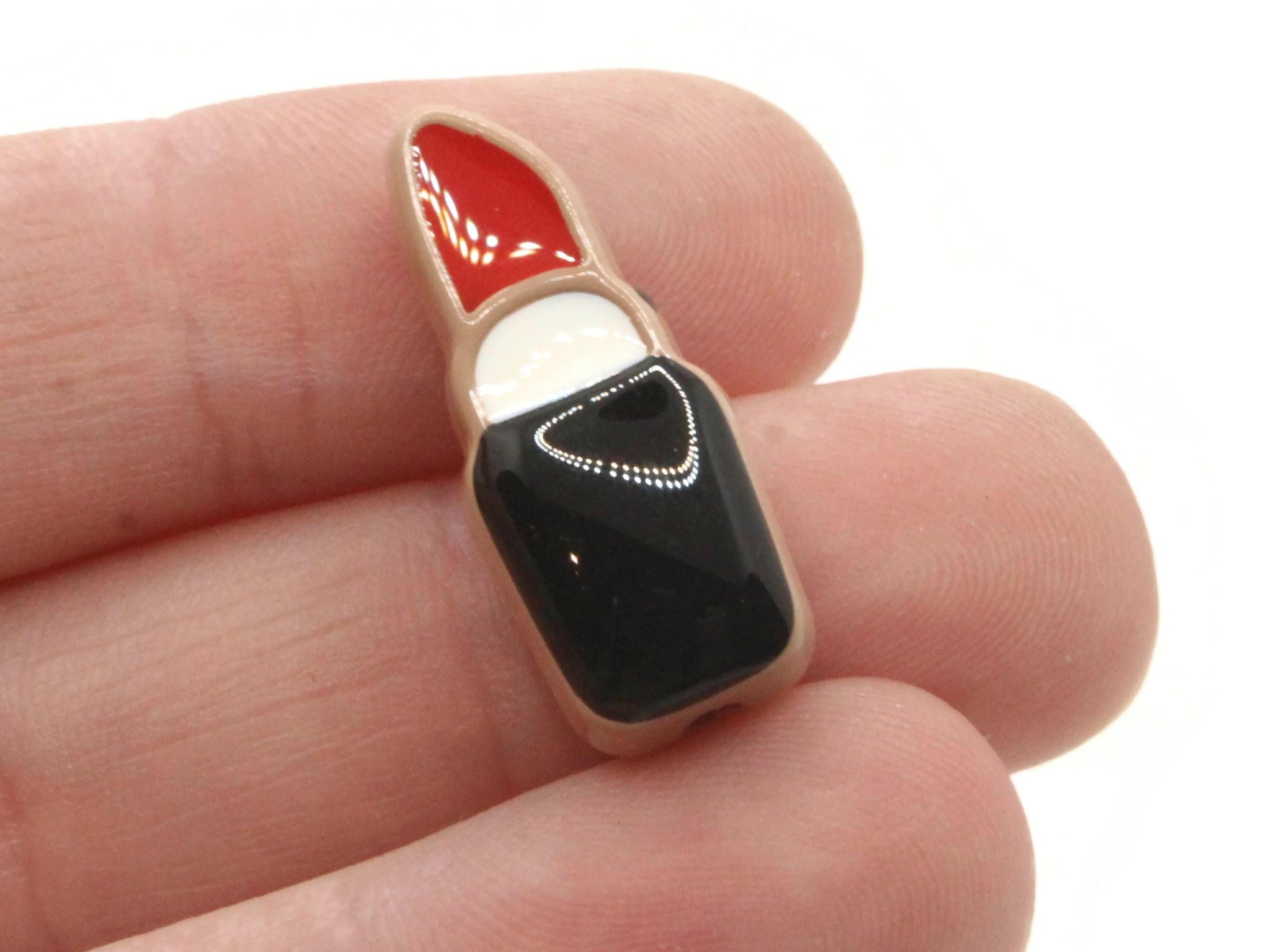 Adorable tubes of lipstick. So fun and fabulous. These have a hole that go through the center from top to bottom. A plastic bead with three colors of enamel applied to make the fun tube shape. The enamel is not always perfect, sometimes colors run together a bit or there's a mark. They're still adorable.